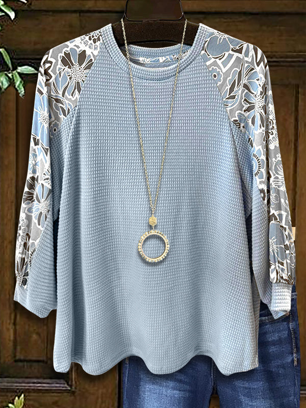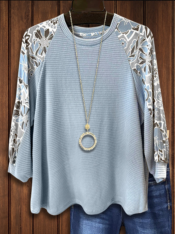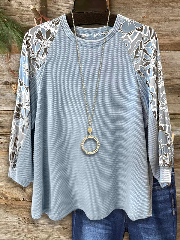 This top combines floral prints with waffle texture patchwork for a unique, cozy look. Pair it with leggings or jeans for an effortlessly stylish Southern outfit.