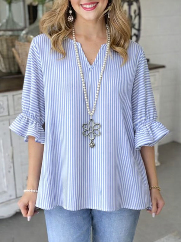 Meet your new go-to: the Skyline Stripe V-Neck Pleat Tunic. Crisp vertical stripes and a flattering V neckline create an easy polished look, while the front pleat adds movement and a flowy drape. Finished with soft elastic ruffle sleeves for a feminine touch, this tunic pairs beautifully with skinny jeans or white denim. A timeless piece you’ll reach for again and again.