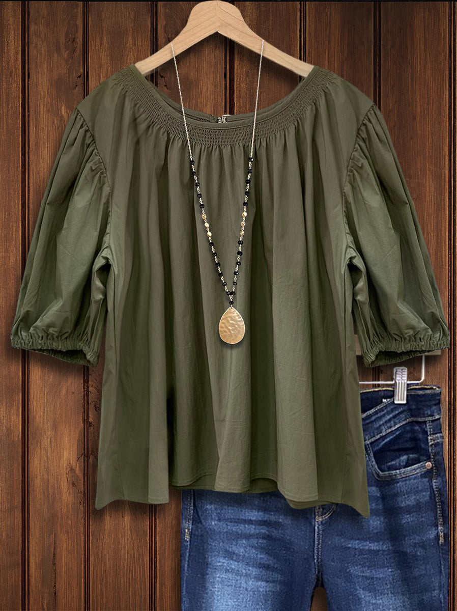 Stay stylish and comfortable in our Solid Color Gathered Casual Blouse. The gathered detail adds a touch of elegance to this classic blouse, while the solid color makes it easy to pair with any bottoms. Whether you dress it up for a night out or keep it casual for a day of running errands, this blouse is a versatile option for any occasion.