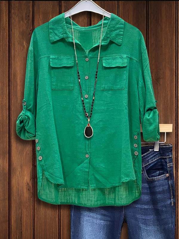 Green Linen Lapel Patch Pocket Shirt