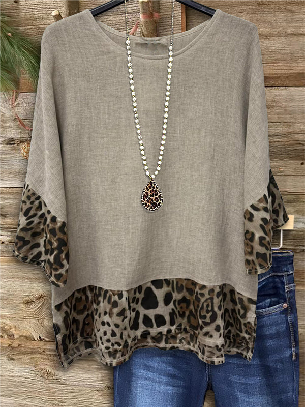 Leopard Print Patchwork Linen Blouse