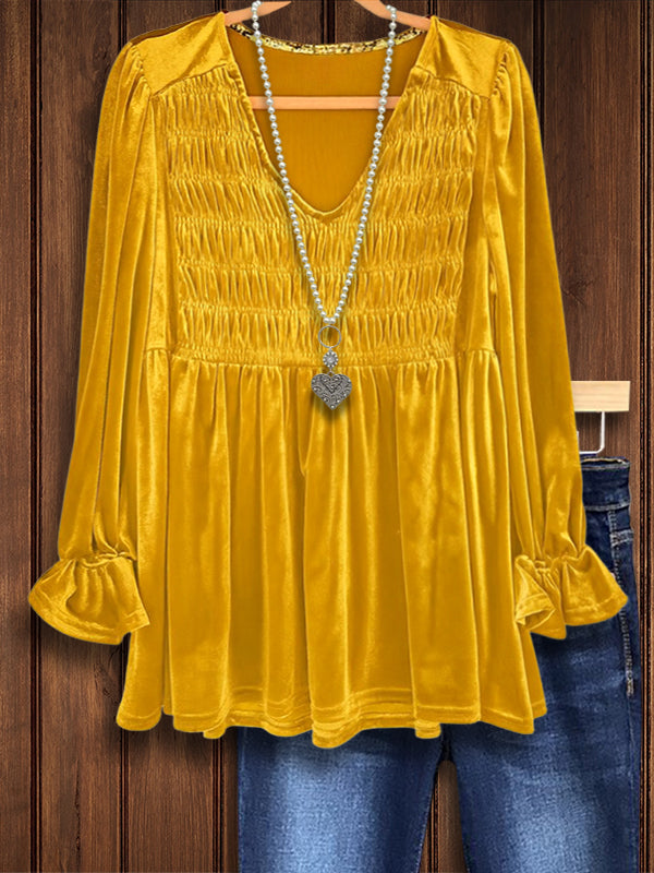 Golden Velvet Smocked V-Neck Blouse